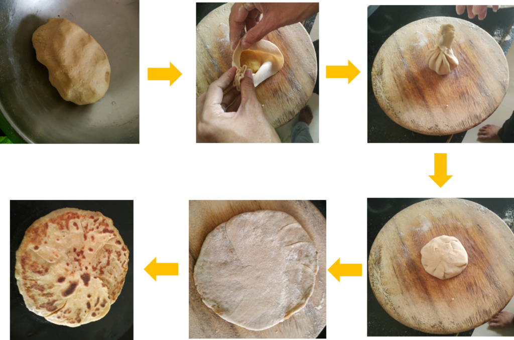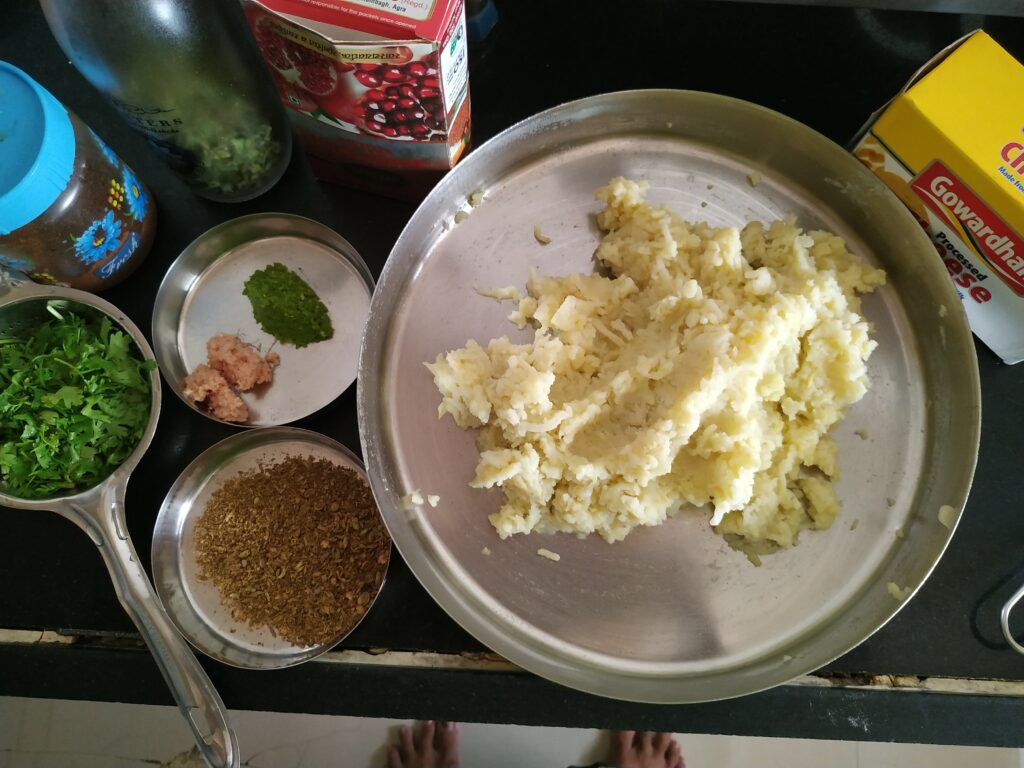 सबसे पहले एक थाली लीजिए। उसमें गेहूं का आटा और चने की दाल का आटा डालिए। उसमें घी डालिए, नमक डालिए और सबको हाथ की मदद से बरोबर मिक्स कीजिए। बाद में उसमें थोड़ा थोड़ा पानी डालकर उसका रोटी के आटे जैसा नरम आटा तैयार करें और उसे आधे घंटे तक रेस्ट दीजिए। अब एक छोटी कढ़ाई में सौंफ, धनिए के बीज (coriander seeds) और अजवाइन डालकर उसको अच्छे से सेक लीजिए। खुशबू आने तक उसे सेकिए। बाद में गैस बंद करके उसे ठंडा होने दीजिये। ठंडा होने के बाद उसे हल्का सा कूट लीजिए। अब आलू को उबालके उसका छिलका निकाल कर उसे आधे से पौने घंटे तक फ्रिज में रख दीजिए।