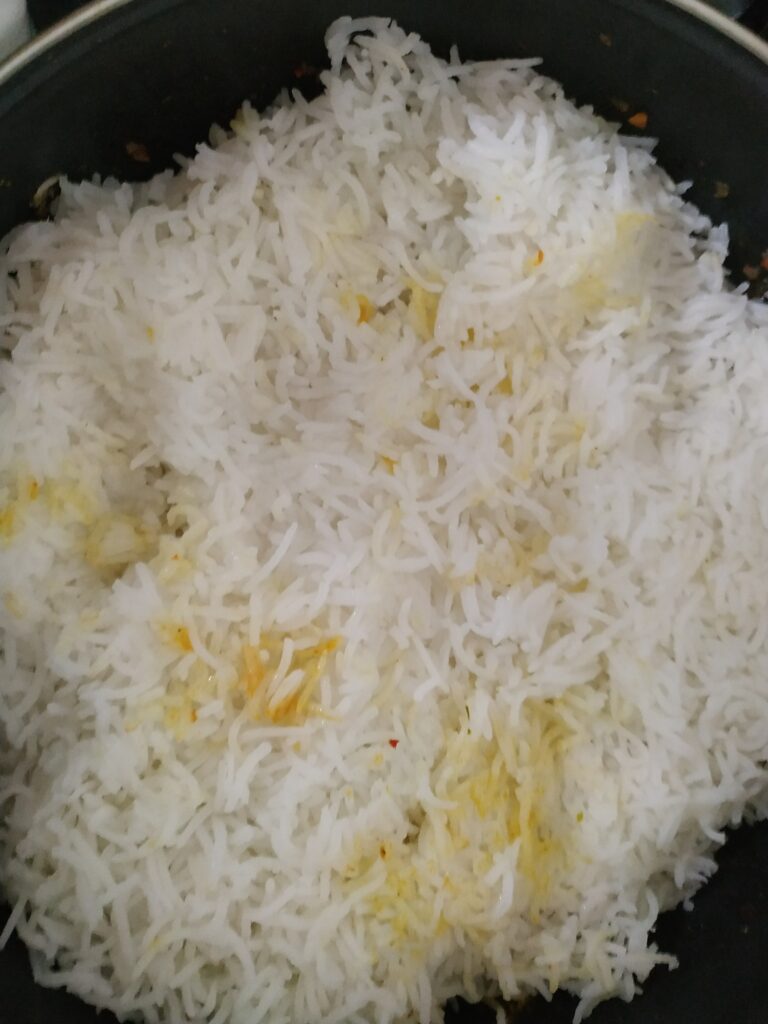 Rinse the basmati rice with water 2-3 times, and then keep them soaked in water for an hour. Then add salt to the rice and boil it until the rice is cooked (use the following proportion for adding water while boiling: 4 glasses of water for every 2 cups of rice). Once cooked, take out the rice in a strainer to let the water escape.