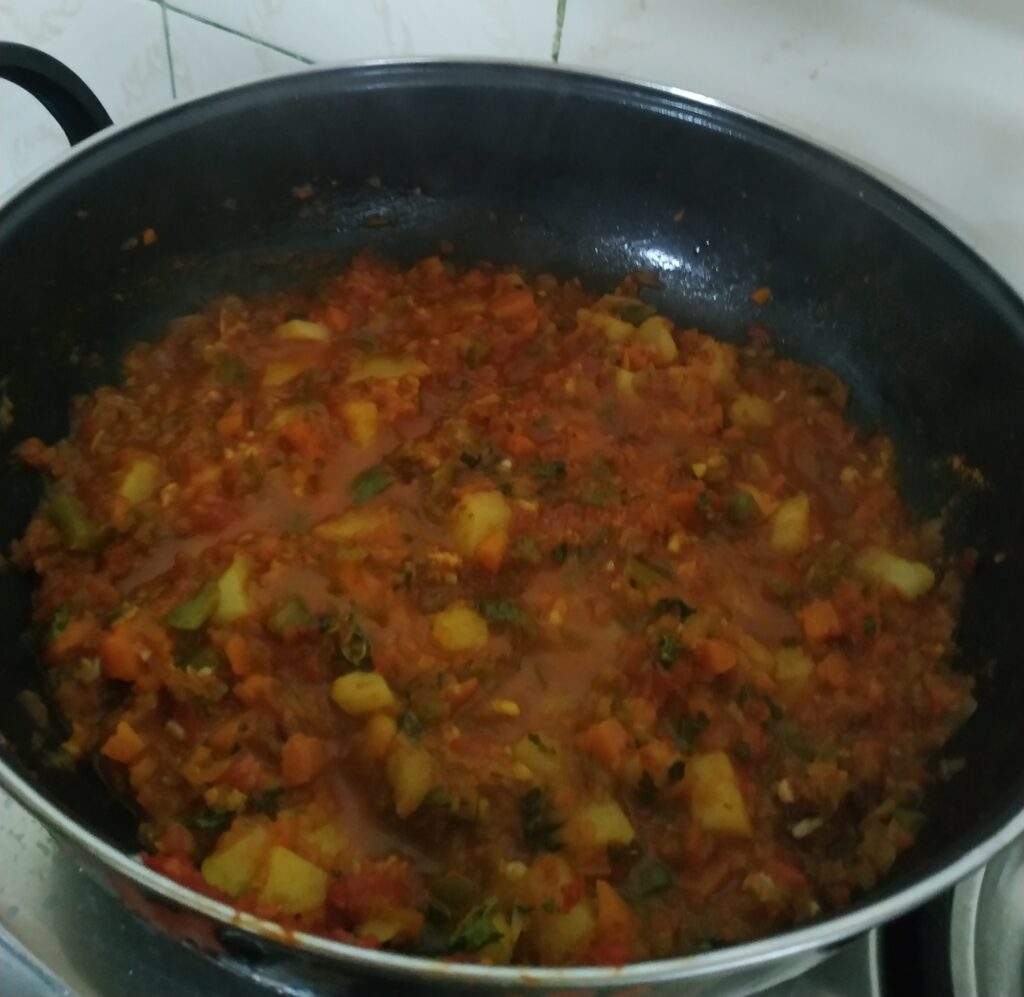 Now, take a large pan and add oil and butter. Once the butter melts, add cumin seeds (jeera). Once the cumin seeds are roasted, add chopped onions to the pan (and salt in proportion) and fry them till their color turns to light pink. Then add ginger paste, garlic paste, and red chilly chutney and stir the mixture. Now add chopped tomatoes to the mixture and once they are cooked, add the boiled vegetables to the mixture and stir well. Then add all the spices to this mixture, followed by vegetable stock, and stir the mixture for some time.