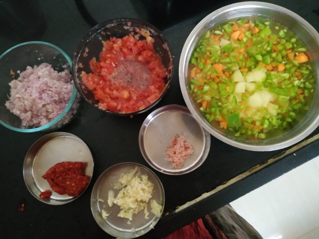 Next, in a cooking pan, add all the vegetables (finely chopped and rinsed) except for onions and tomatoes, 1 glass of water and salt, and boil the mixture. Once the vegetables are boiled, take them out in a strainer. Collect the water escaping from the strainer in a bowl. It forms the vegetable stock that can be used in the pulao itself, or in some other preparations (like the gravy of a curry).